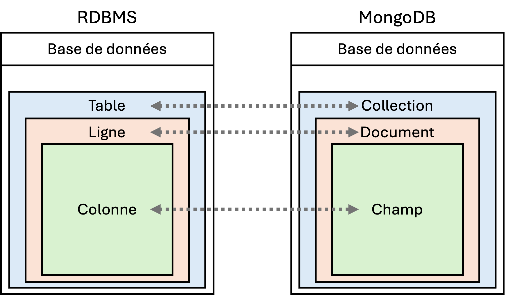 Collections : Les documents sont regroupés dans des collections. Une collection est l’équivalent d’un tableau dans les bases de données relationnelles. Elle ne possède pas de structure prédéfinie et peut contenir des documents de types différents. Les collections sont utilisées pour organiser et regrouper des ensembles de données similaires.